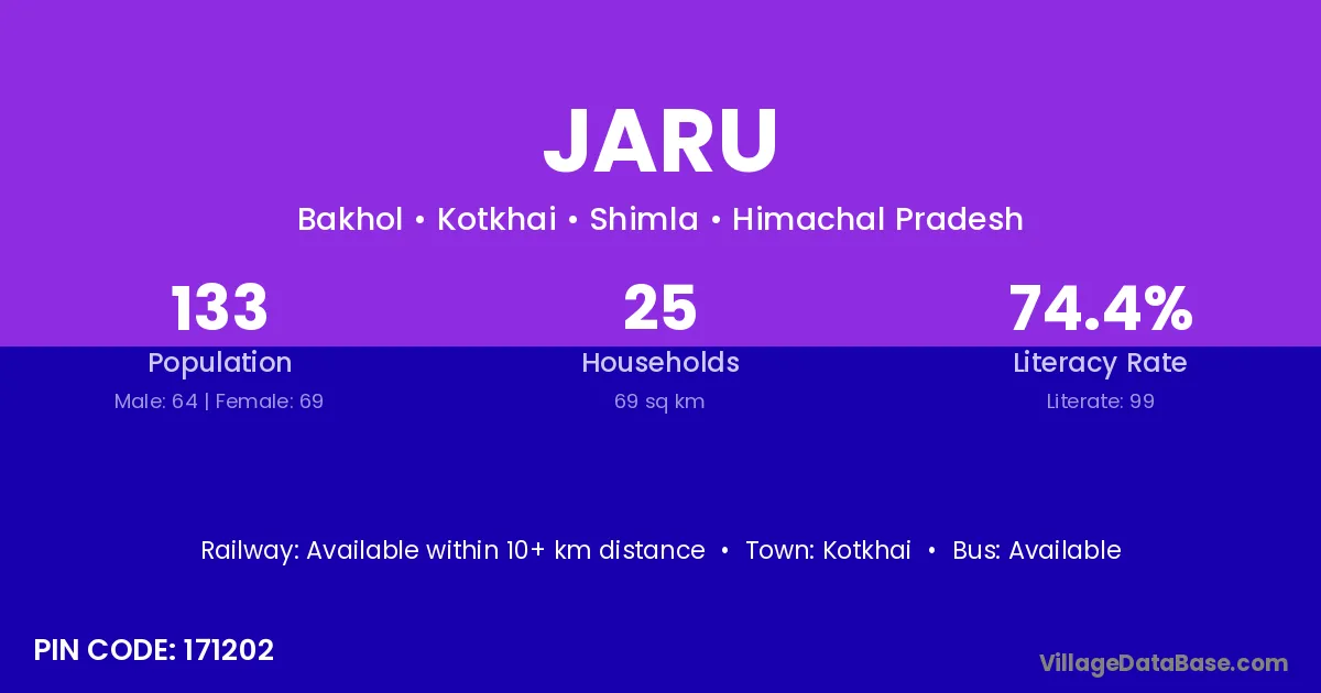 The literacy rate of Jaru village is 63.74%. Male literacy stands at 76.84% and female literacy at 49.70%.