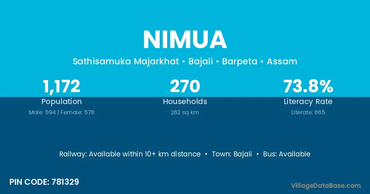 According to Census 2011 information, the village code of Nimua village is 835102.