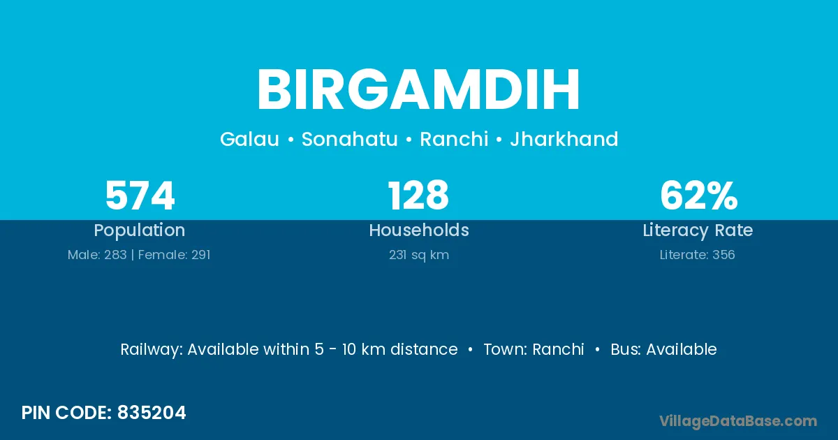 Birgamdih village has a total population of 574 people, of which 283 are males and 291 are females.