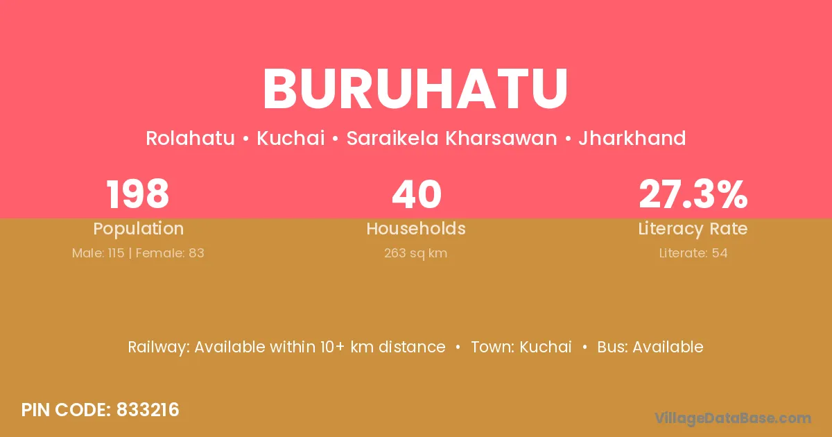 The literacy rate of Buruhatu village is 39.97%. Male literacy stands at 54.75% and female literacy at 25.08%.