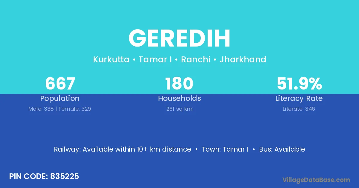 Geredih village has a total population of 667 people, of which 338 are males and 329 are females.