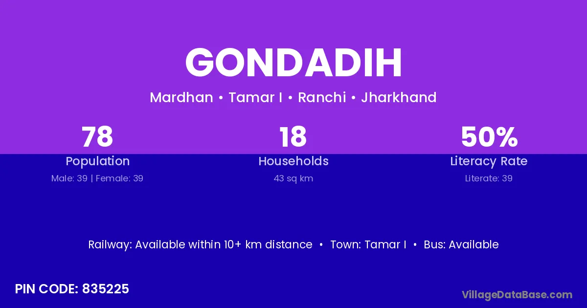 Gondadih village has a total population of 78 people, of which 39 are males and 39 are females.