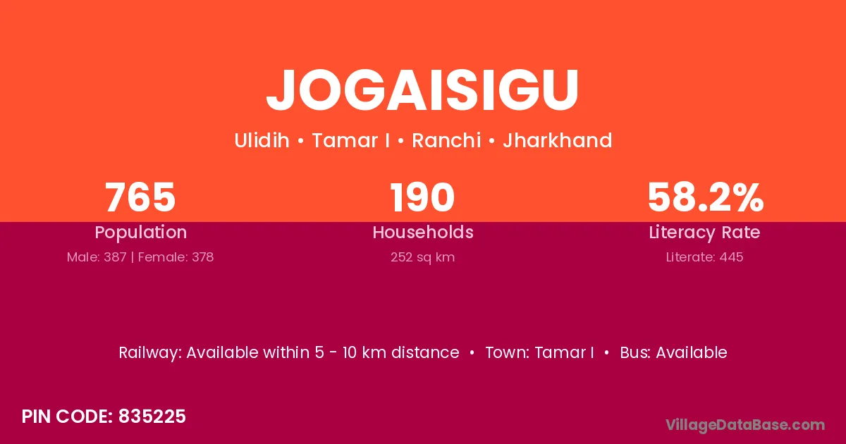 Jogaisigu village has a total population of 765 people, of which 387 are males and 378 are females.