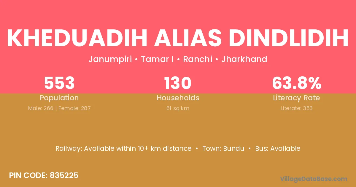Kheduadih Alias Dindlidih village has a total population of 553 people, of which 266 are males and 287 are females.