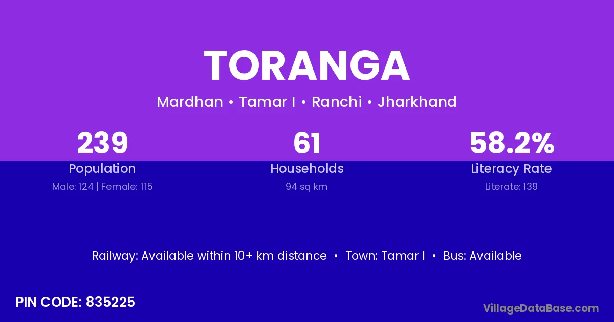 Toranga village has a total population of 239 people, of which 124 are males and 115 are females.