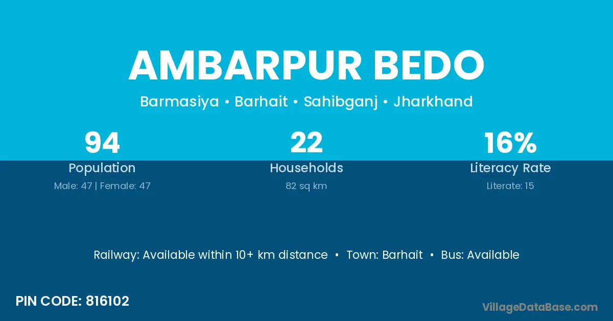 Ambarpur Bedo village has a total population of 94 people, of which 47 are males and 47 are females.