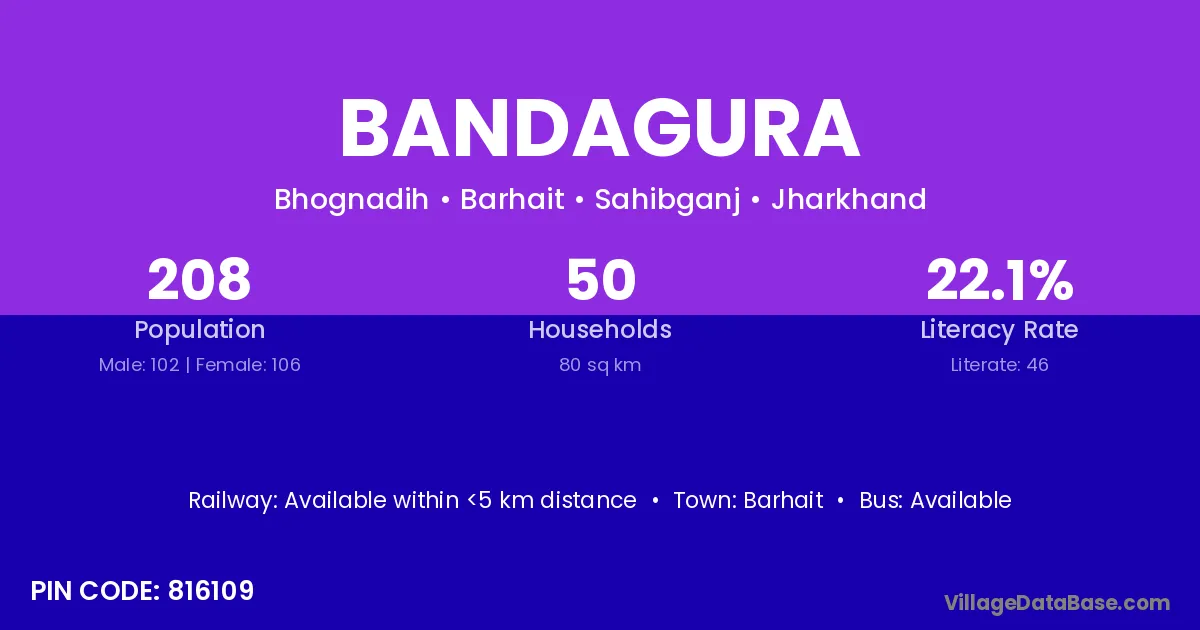 Bandagura village has a total population of 208 people, of which 102 are males and 106 are females.