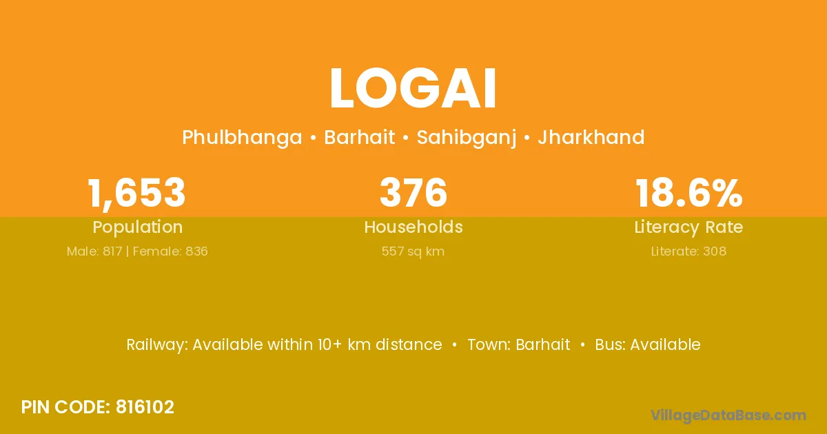 The literacy rate of Logai village is 18.63%. Male literacy stands at 23.50% and female literacy at 13.88%.