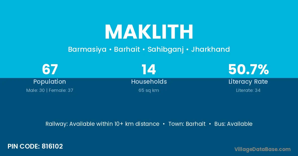 Maklith village has a total population of 67 people, of which 30 are males and 37 are females.