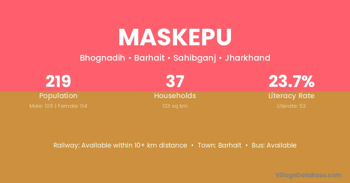 The literacy rate of Maskepu village is 23.74%. Male literacy stands at 32.38% and female literacy at 15.79%.