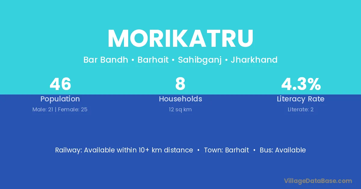 The literacy rate of Morikatru village is 4.35%. Male literacy stands at 9.52% and female literacy at 0.00%.