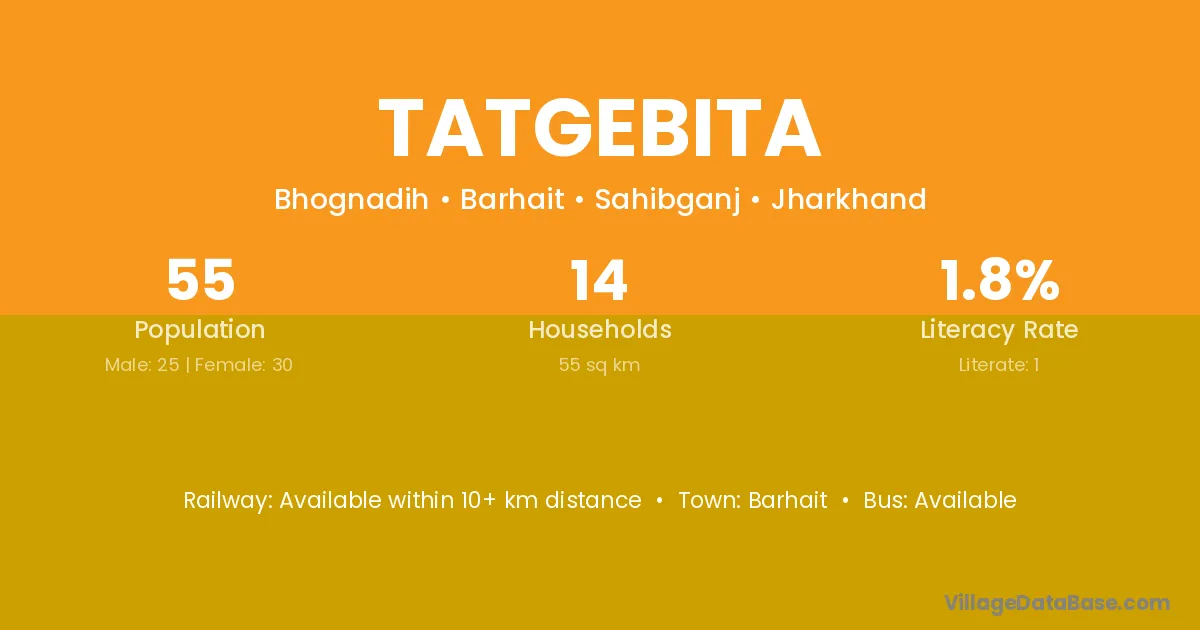 Tatgebita village has a total population of 55 people, of which 25 are males and 30 are females.