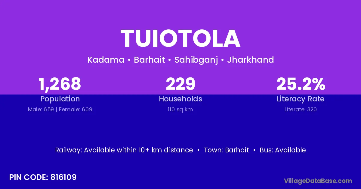 The literacy rate of Tuiotola village is 25.24%. Male literacy stands at 33.38% and female literacy at 16.42%.