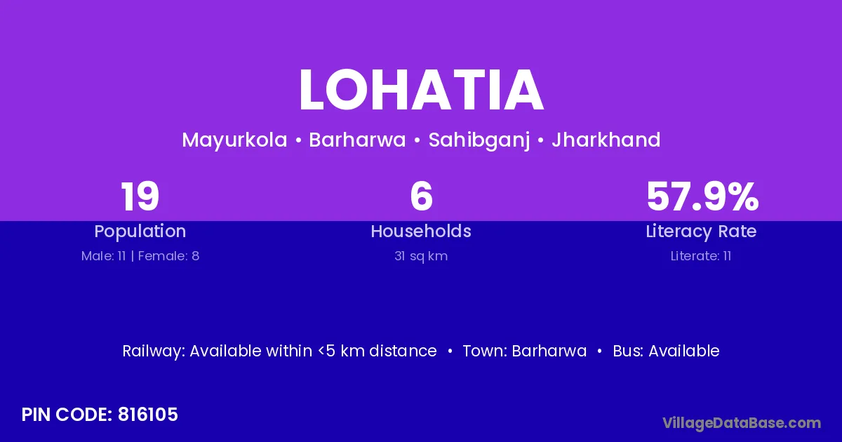 Lohatia village has a total population of 19 people, of which 11 are males and 8 are females.
