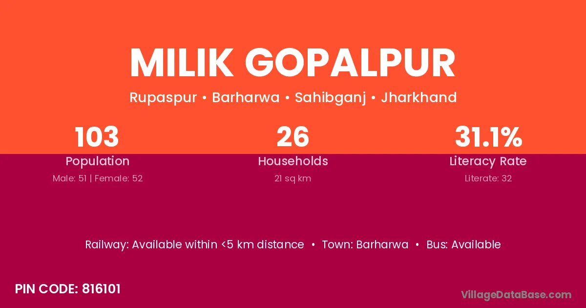 Barharwa is the nearest town to Milik Gopalpur village for major economic activities