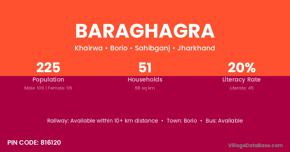 Baraghagra village has a total population of 225 people, of which 109 are males and 116 are females.