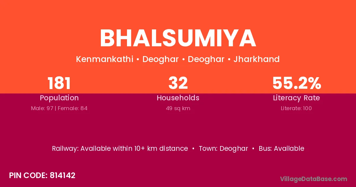 The literacy rate of Bhalsumiya village is 17.26%. Male literacy stands at 25.88% and female literacy at 9.23%.