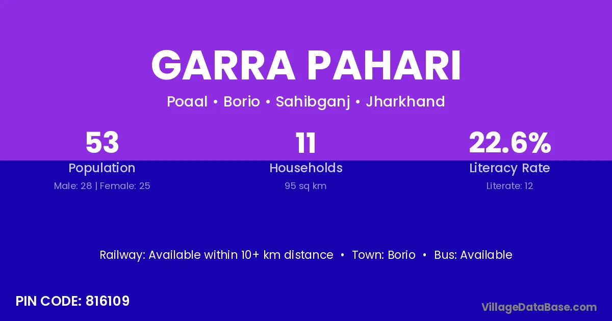 Garra Pahari village has a total population of 53 people, of which 28 are males and 25 are females.