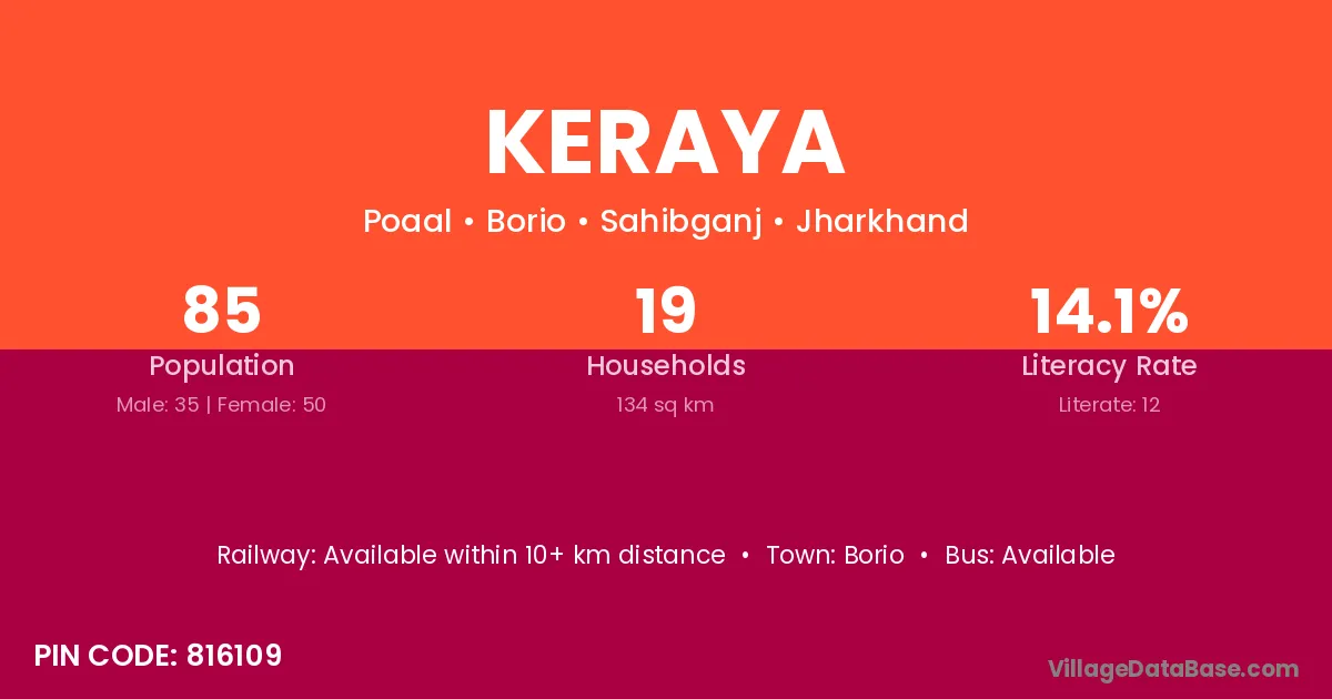 Keraya village has a total population of 85 people, of which 35 are males and 50 are females.