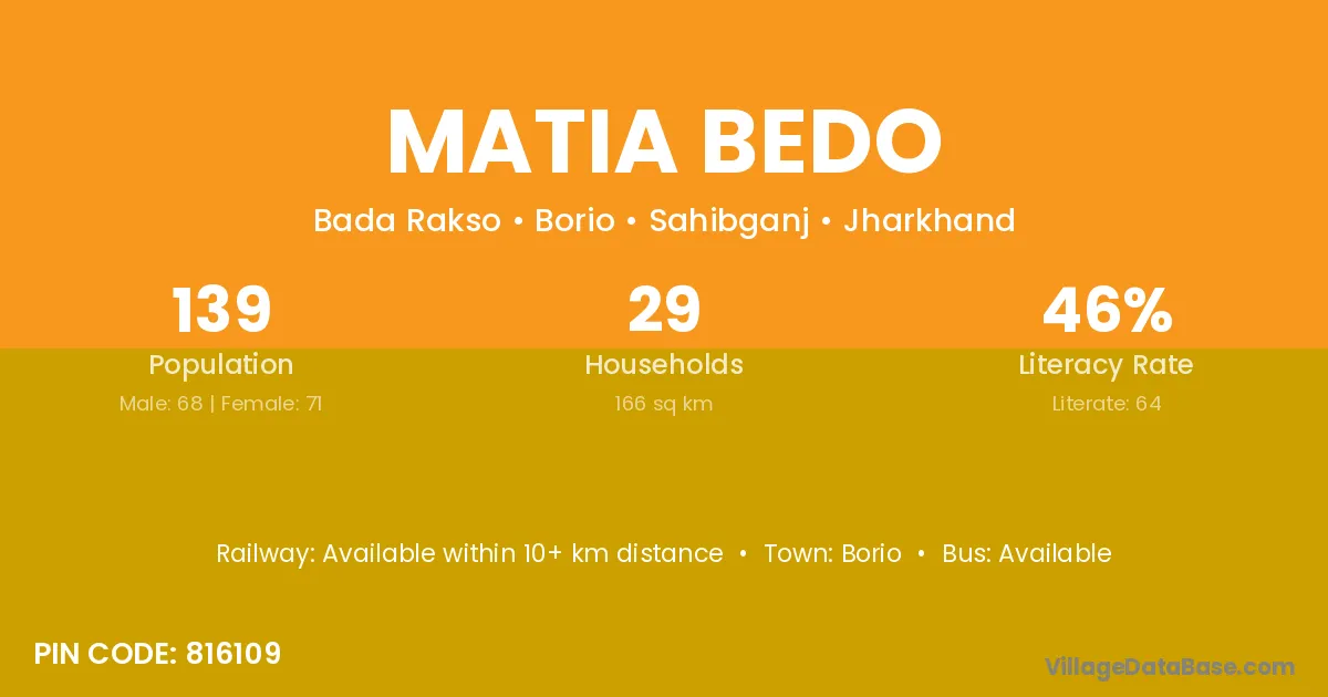 Matia Bedo village has a total population of 139 people, of which 68 are males and 71 are females.