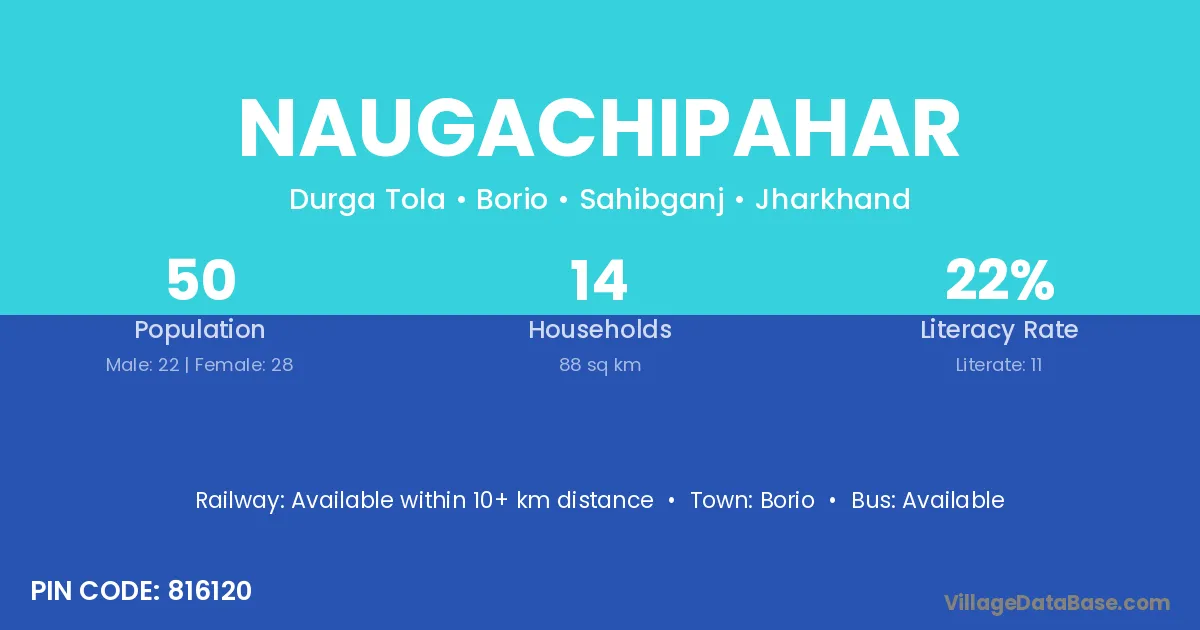 The literacy rate of Naugachipahar village is 22.00%. Male literacy stands at 27.27% and female literacy at 17.86%.