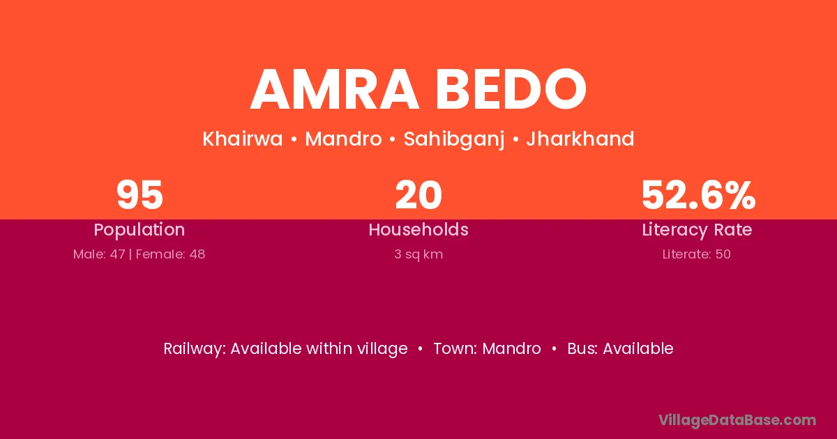 Amra Bedo village has a total population of 95 people, of which 47 are males and 48 are females.