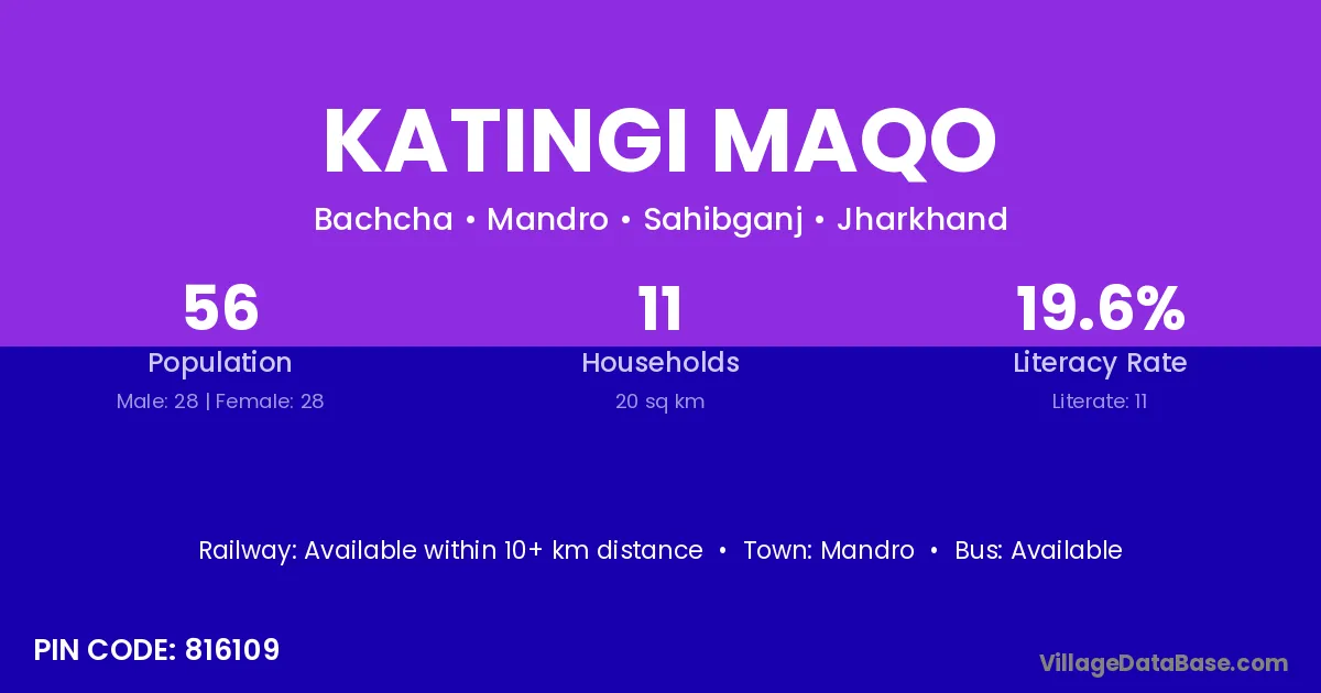 The literacy rate of Katingi Maqo village is 19.64%. Male literacy stands at 21.43% and female literacy at 17.86%.