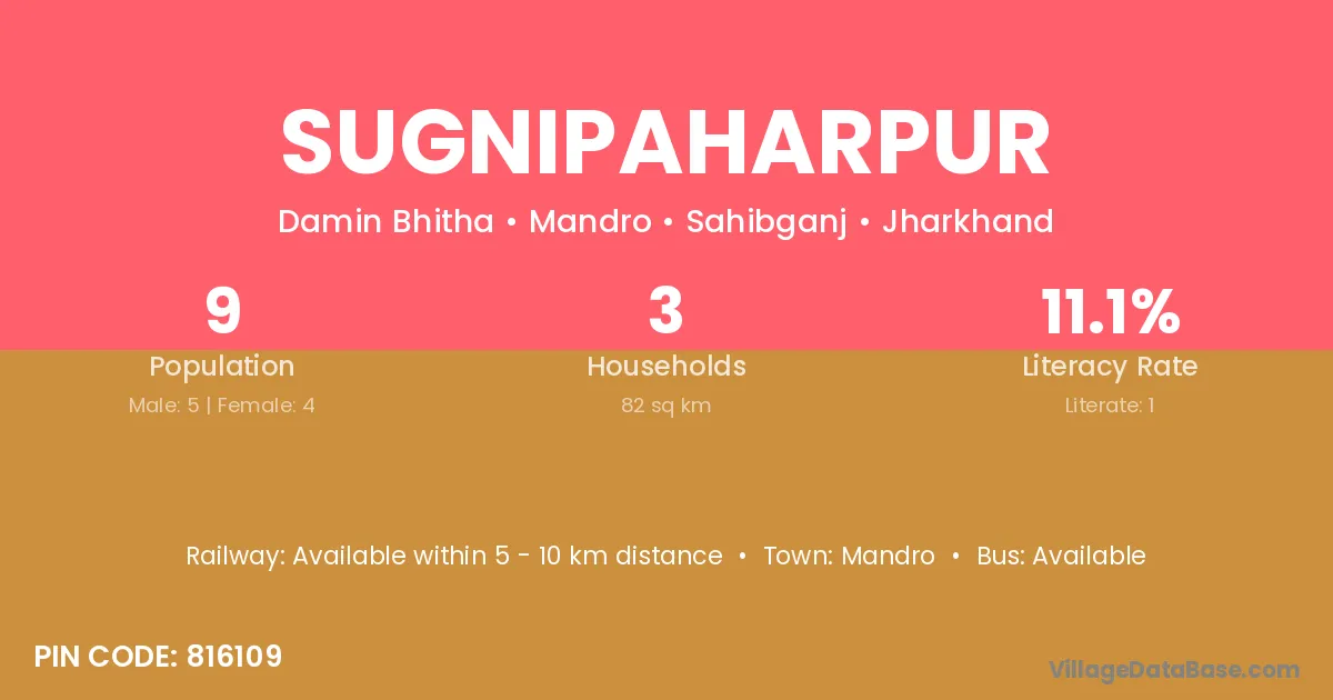 Sugnipaharpur village has a total population of 9 people, of which 5 are males and 4 are females.