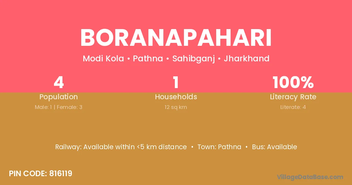 Boranapahari village has a total population of 4 people, of which 1 are males and 3 are females.