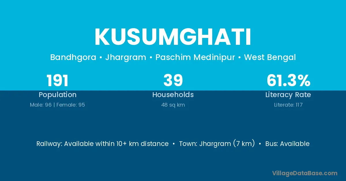 The literacy rate of Kusumghati village is 0.00%. Male literacy stands at 0.00% and female literacy at 0.00%.