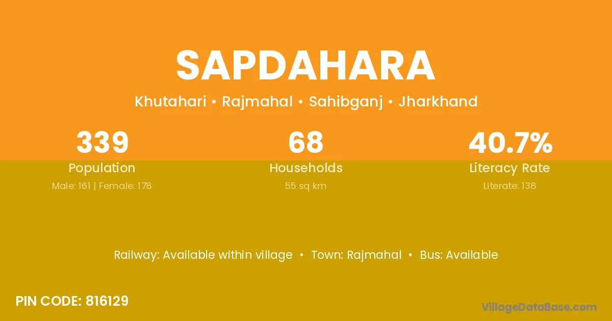 The literacy rate of Sapdahara village is 40.71%. Male literacy stands at 49.07% and female literacy at 33.15%.