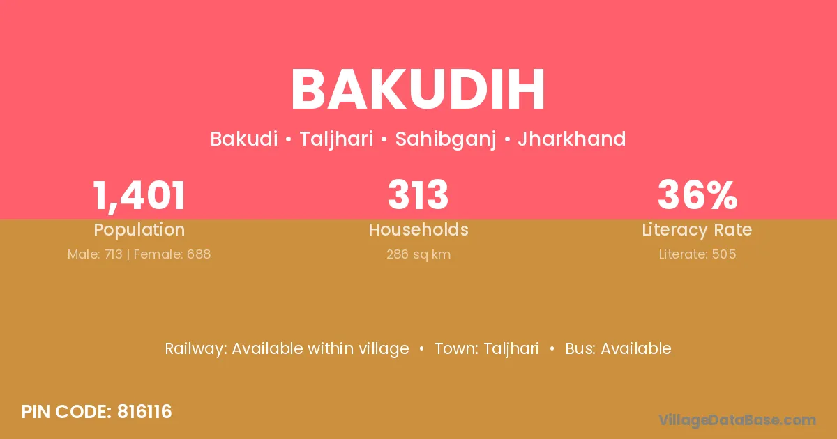 Bakudih village has a total population of 1,401 people, of which 713 are males and 688 are females.