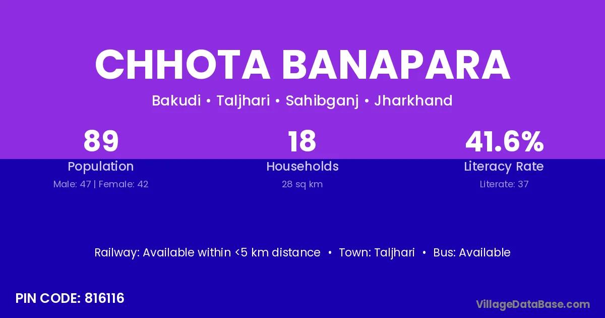Chhota Banapara village has a total population of 89 people, of which 47 are males and 42 are females.