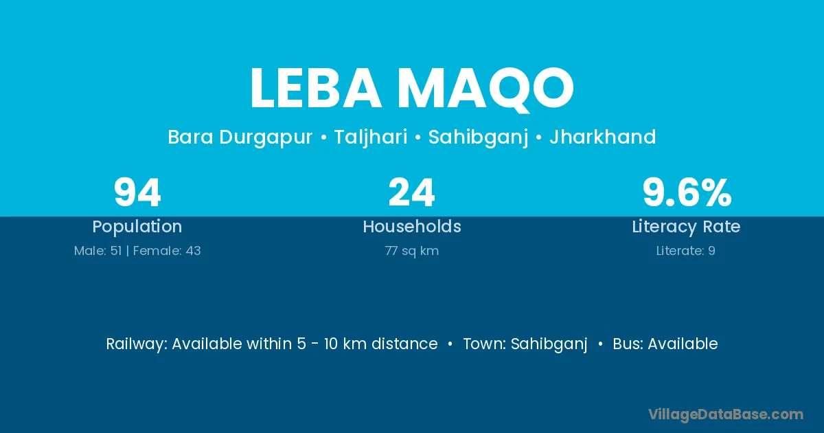 The literacy rate of Leba Maqo village is 9.57%. Male literacy stands at 17.65% and female literacy at 0.00%.