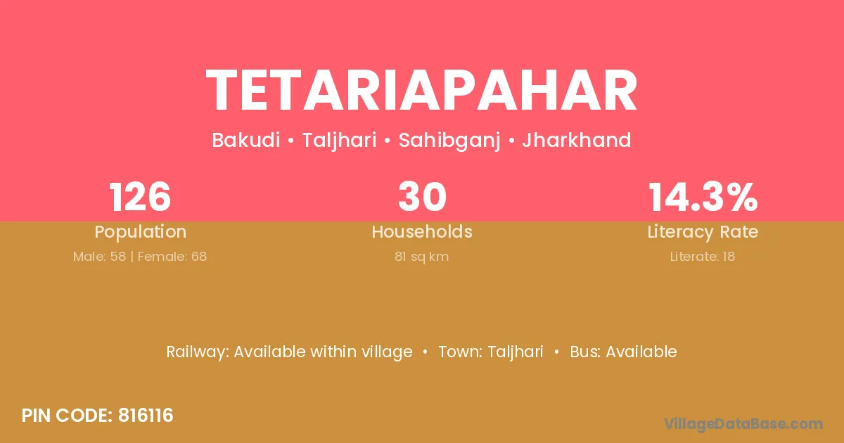 Tetariapahar village has a total population of 126 people, of which 58 are males and 68 are females.