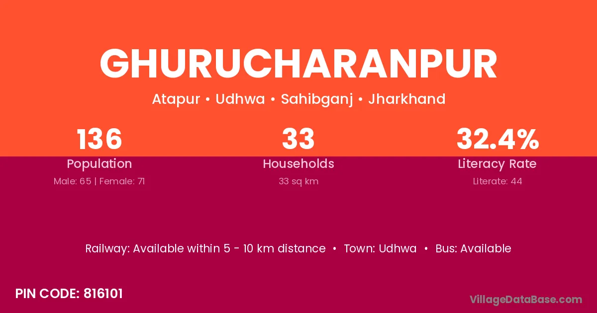 Ghurucharanpur village has a total population of 136 people, of which 65 are males and 71 are females.