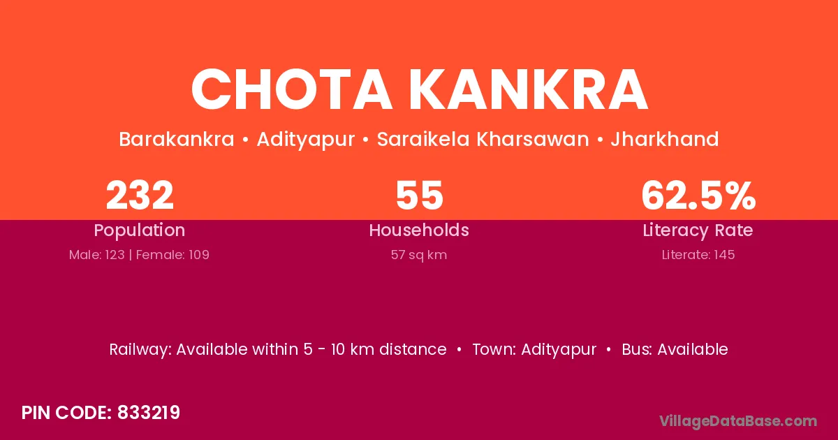 Adityapur is the nearest town to Chota Kankra village for major economic activities