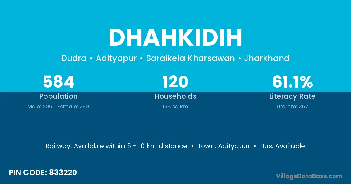 Adityapur is the nearest town to Dhahkidih village for major economic activities