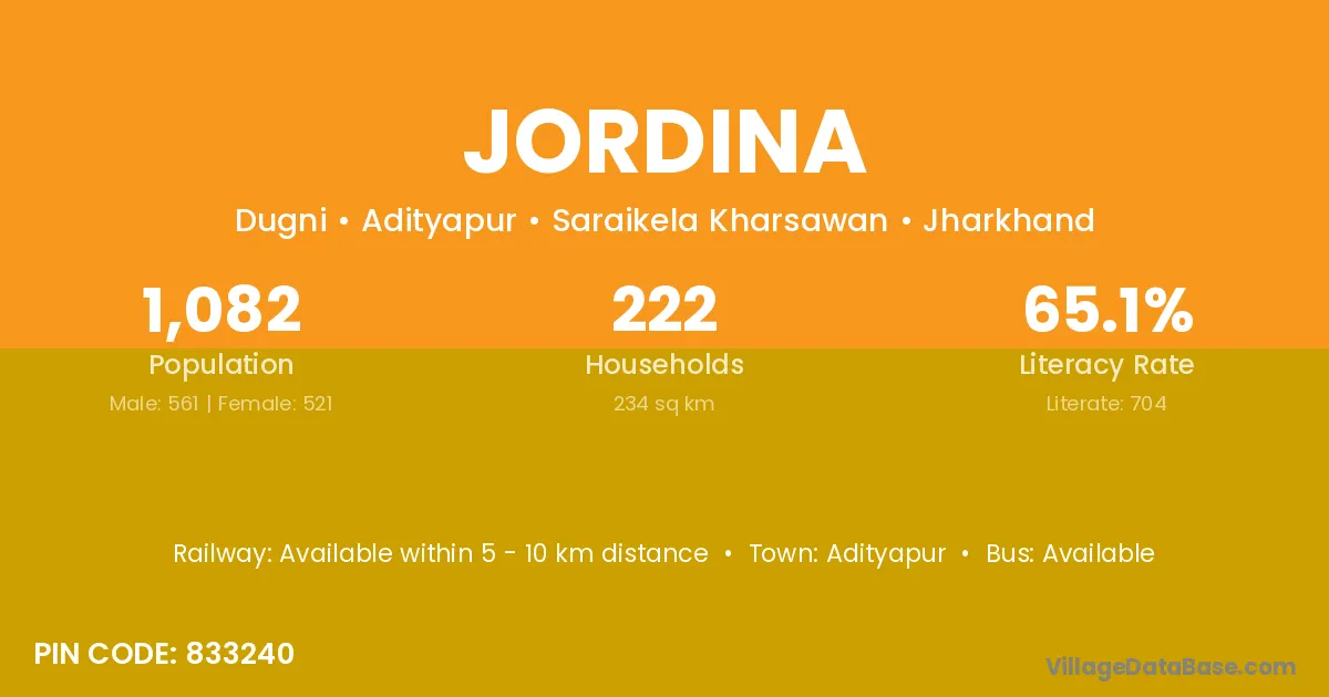 Adityapur is the nearest town to Jordina village for major economic activities