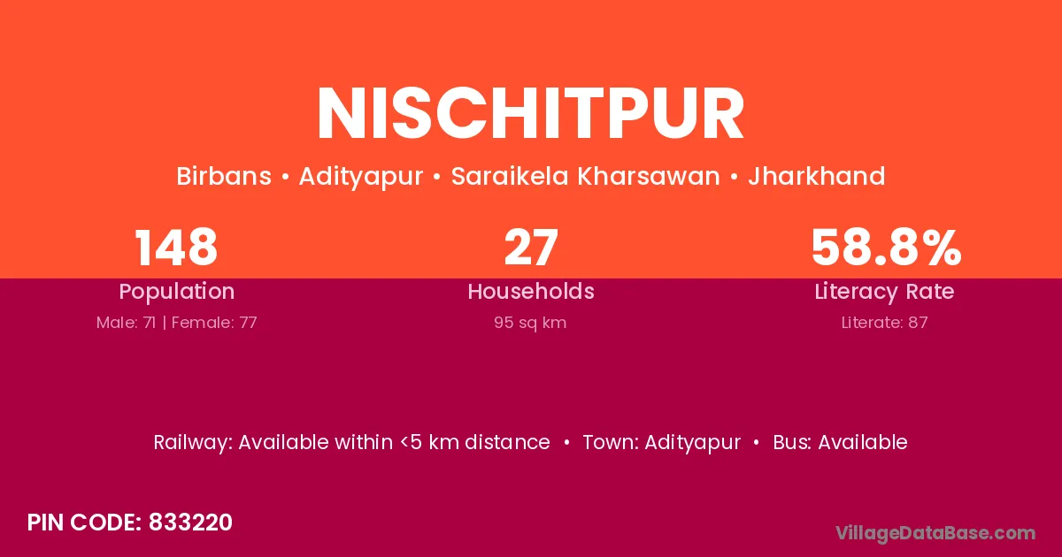 Nischitpur village has a total population of 148 people, of which 71 are males and 77 are females.