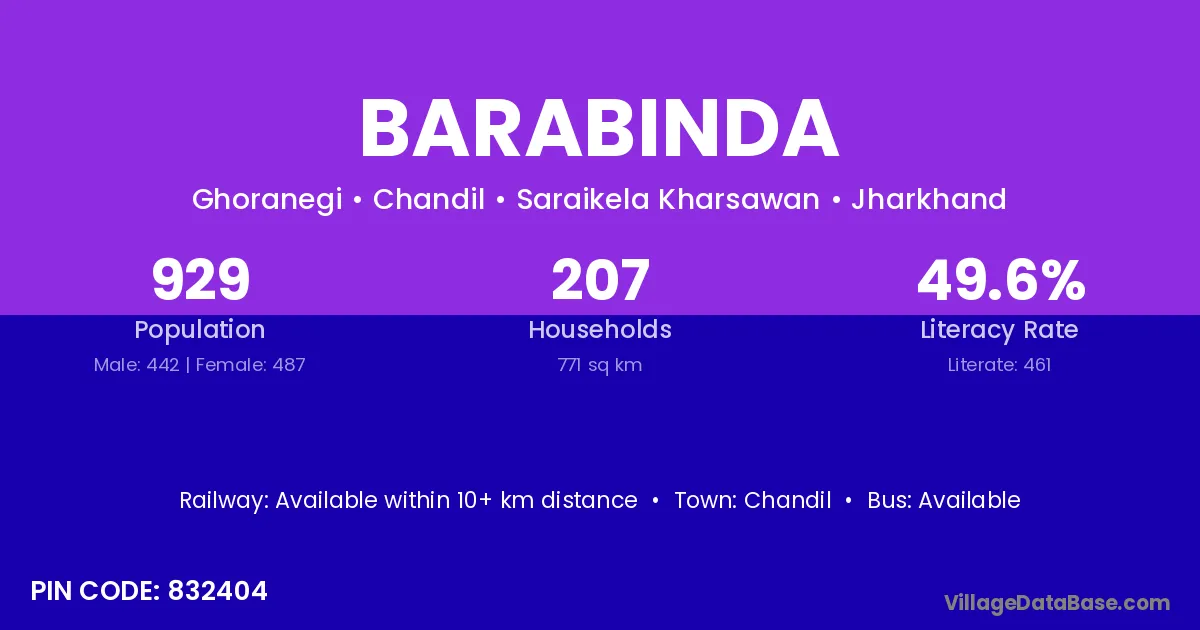 According to Census 2011 information, the village code of Barabinda village is 832404.