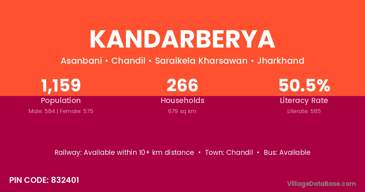 Kandarberya village has a total population of 1,159 people, of which 584 are males and 575 are females.