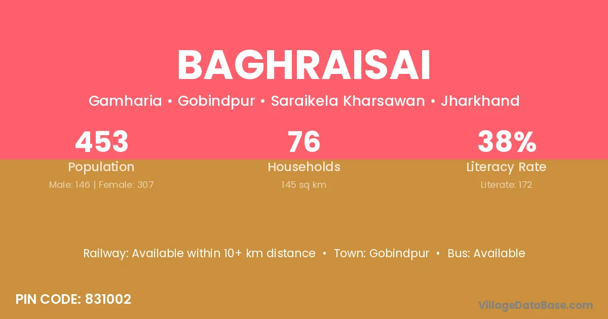 Baghraisai village has a total population of 453 people, of which 146 are males and 307 are females.
