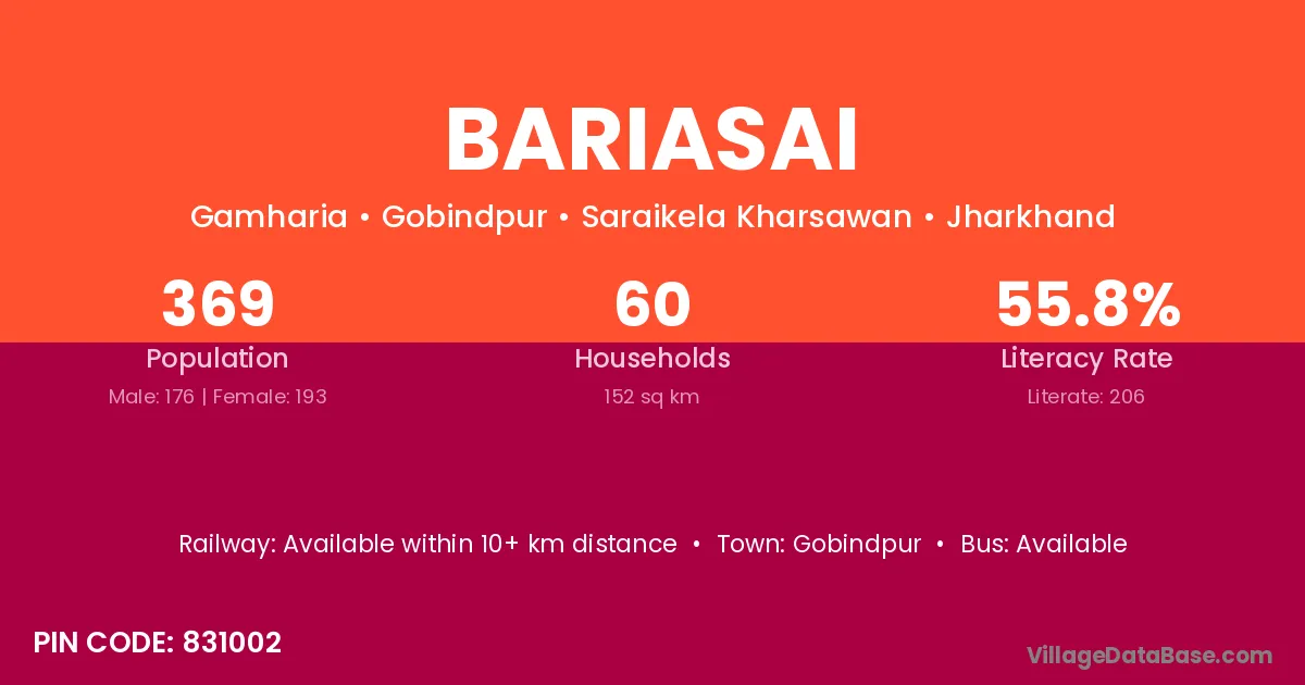 Bariasai village has a total population of 369 people, of which 176 are males and 193 are females.