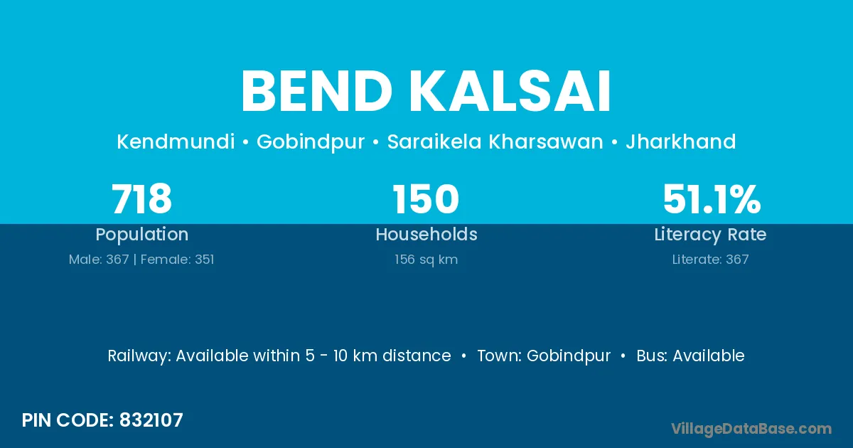 Bend Kalsai village has a total population of 718 people, of which 367 are males and 351 are females.
