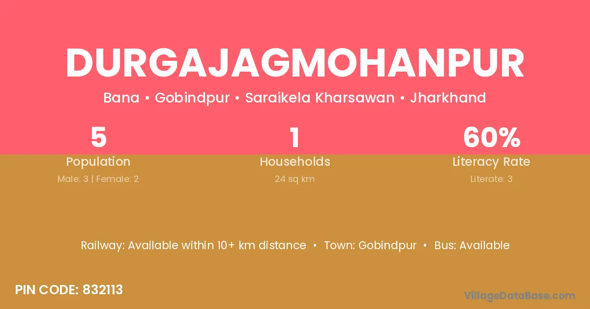 Durgajagmohanpur village has a total population of 5 people, of which 3 are males and 2 are females.