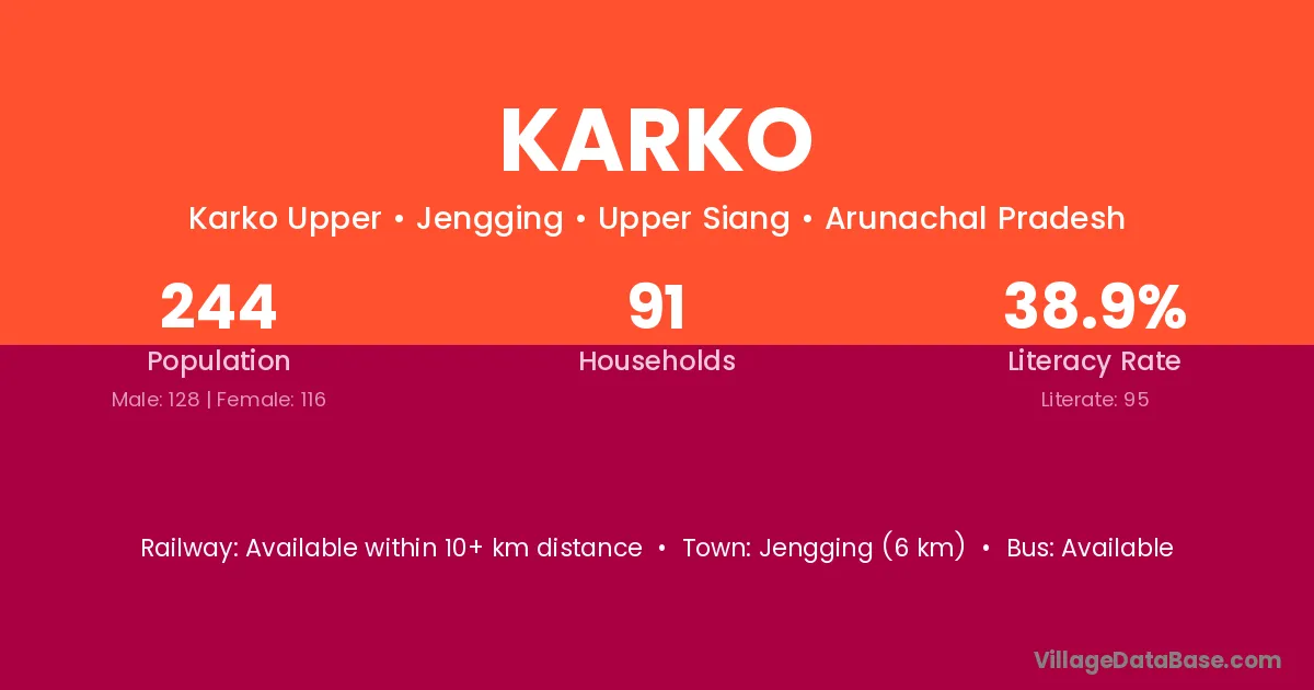 The literacy rate of Karko village is 53.08%. Male literacy stands at 59.76% and female literacy at 46.51%.