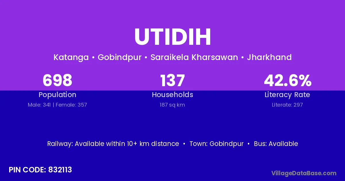 The literacy rate of Utidih village is 42.55%. Male literacy stands at 55.43% and female literacy at 30.25%.