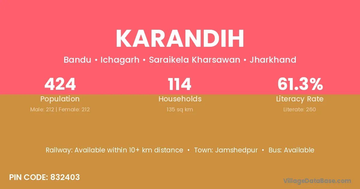 Karandih village has a total population of 424 people, of which 212 are males and 212 are females.