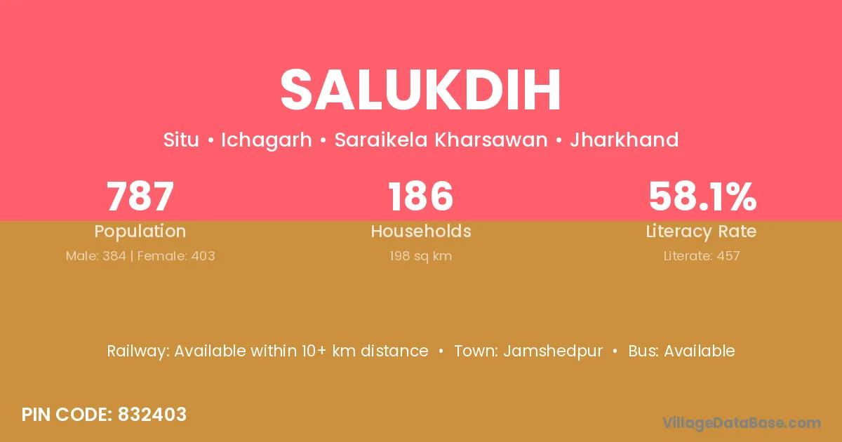 Salukdih village has a total population of 787 people, of which 384 are males and 403 are females.